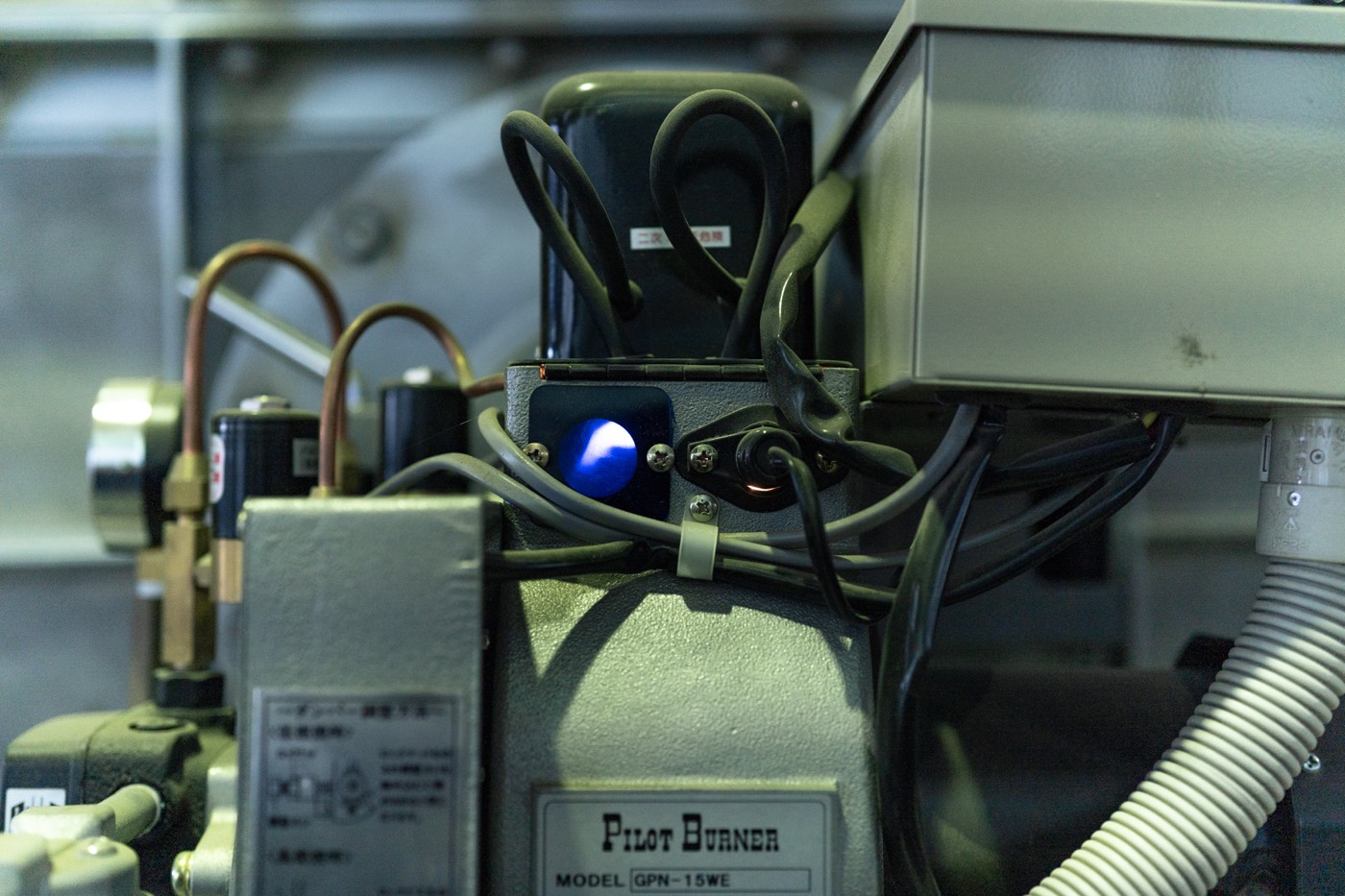 酸素を遮断した密閉状態。ほとんど外からは見えないが、青い炎が静かに揺れる