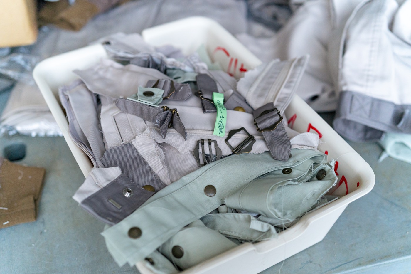 ボタンやファスナーなど土に還らない金属部分はあらかじめ取り除いているんですよ。その作業場も今ちょうど稼働していますから、案内しますね。ここでは近所の学生さんがボタンやファスナーなどの金属部分を丁寧に取り除いています。