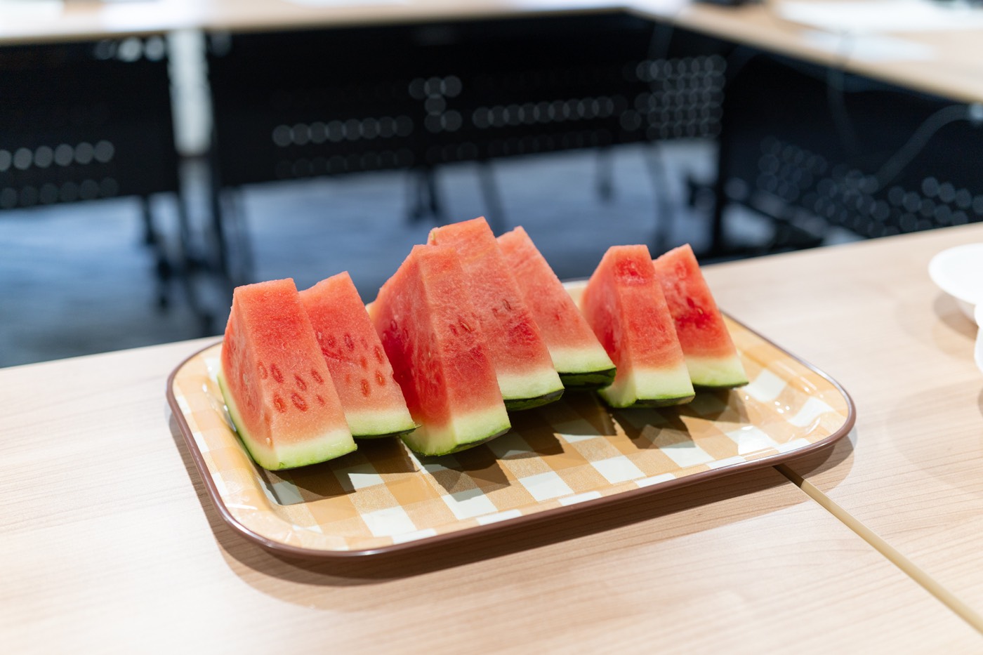 会議室に到着したら、敷地内の畑で採れたスイカをご用意して歓迎してくださるCIRCULAR CARBON社の皆さま。