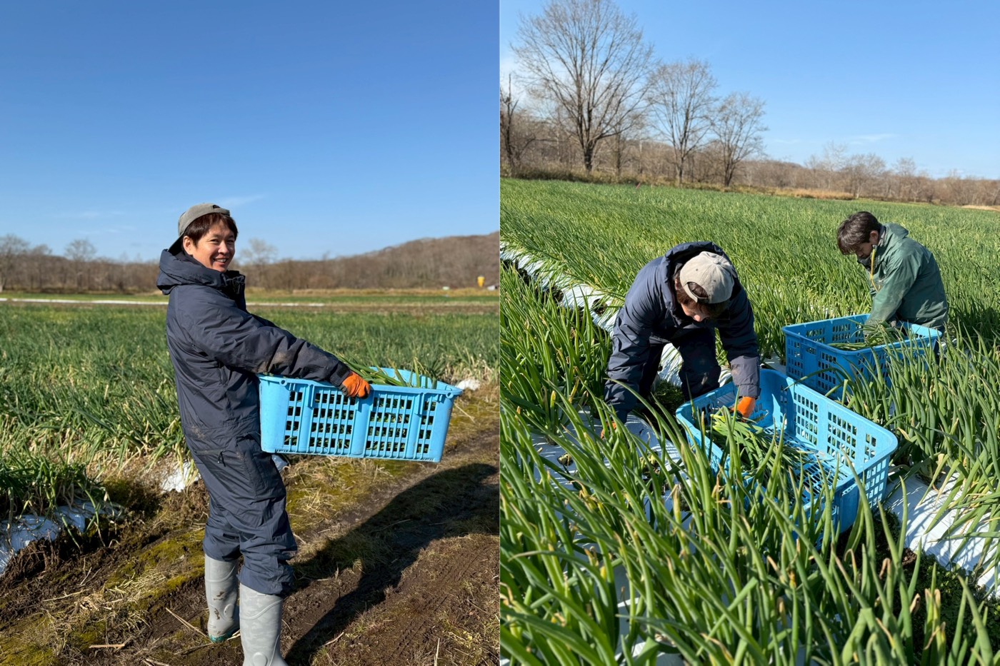 土壌改良材を散布した土で育った青ネギたちを、CIRCULAR CARBON社の松本さん自ら収穫のお手伝い。