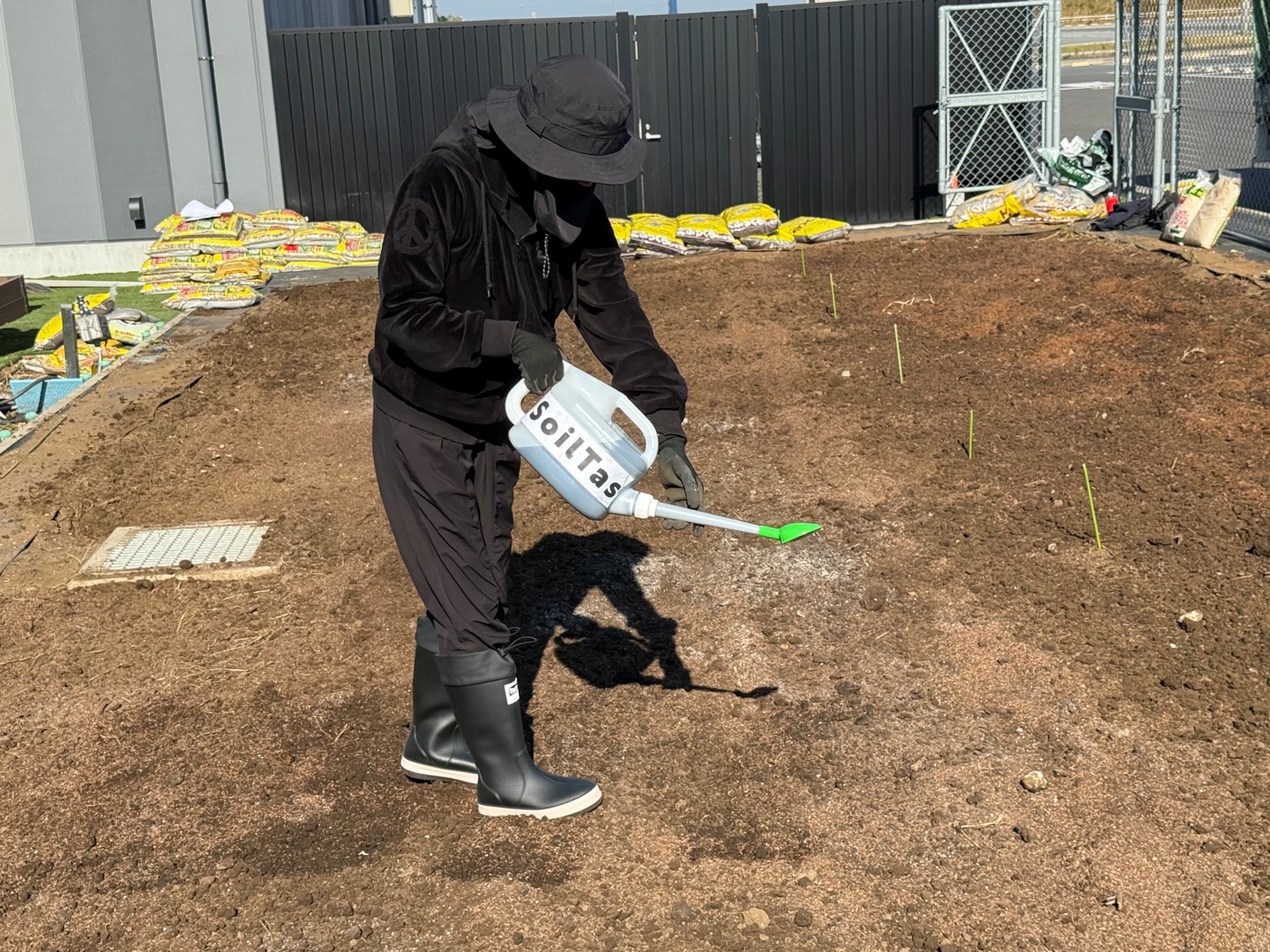 まずは土の状態を検査するところからスタート。そして土を耕し、土壌改良材を散布。