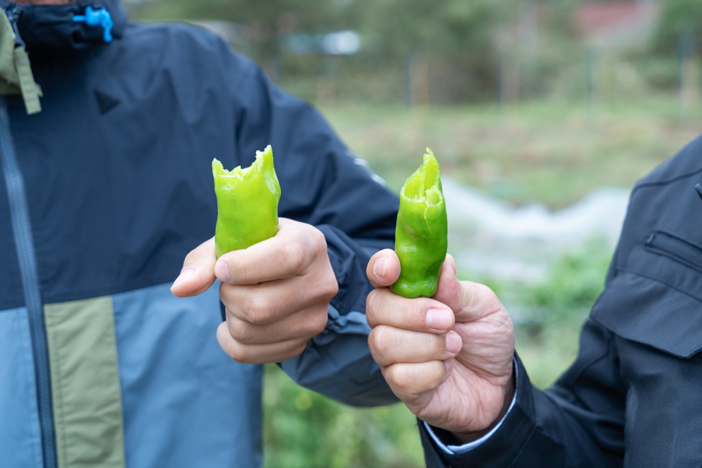 これから詳しい説明もしますが、畑もぜひ見てみてください。ここはうちでやってる畑です。この大きな野菜はユウガオです。かんぴょうはこのユウガオから作られているんですよ。他の野菜はほとんど収穫していますが、まだ残ってるのだと万願寺とうがらしなんか、そのまま食べられて今おいしいですよ。