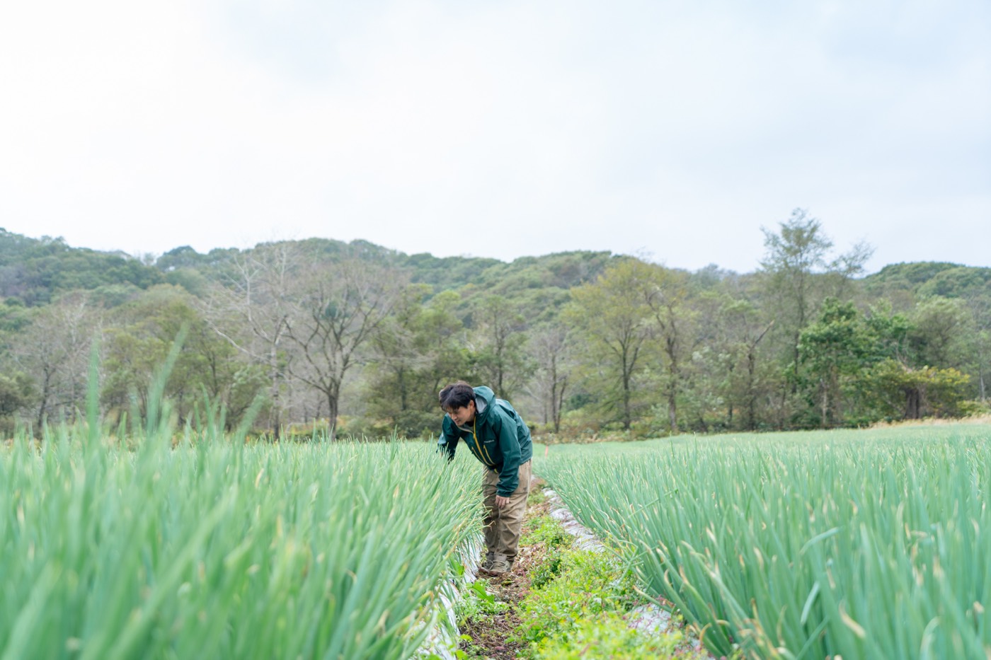 収穫を間近に控えた青ネギの葉が風に揺れ、ねぎ特有の爽やかな香りに包まれています