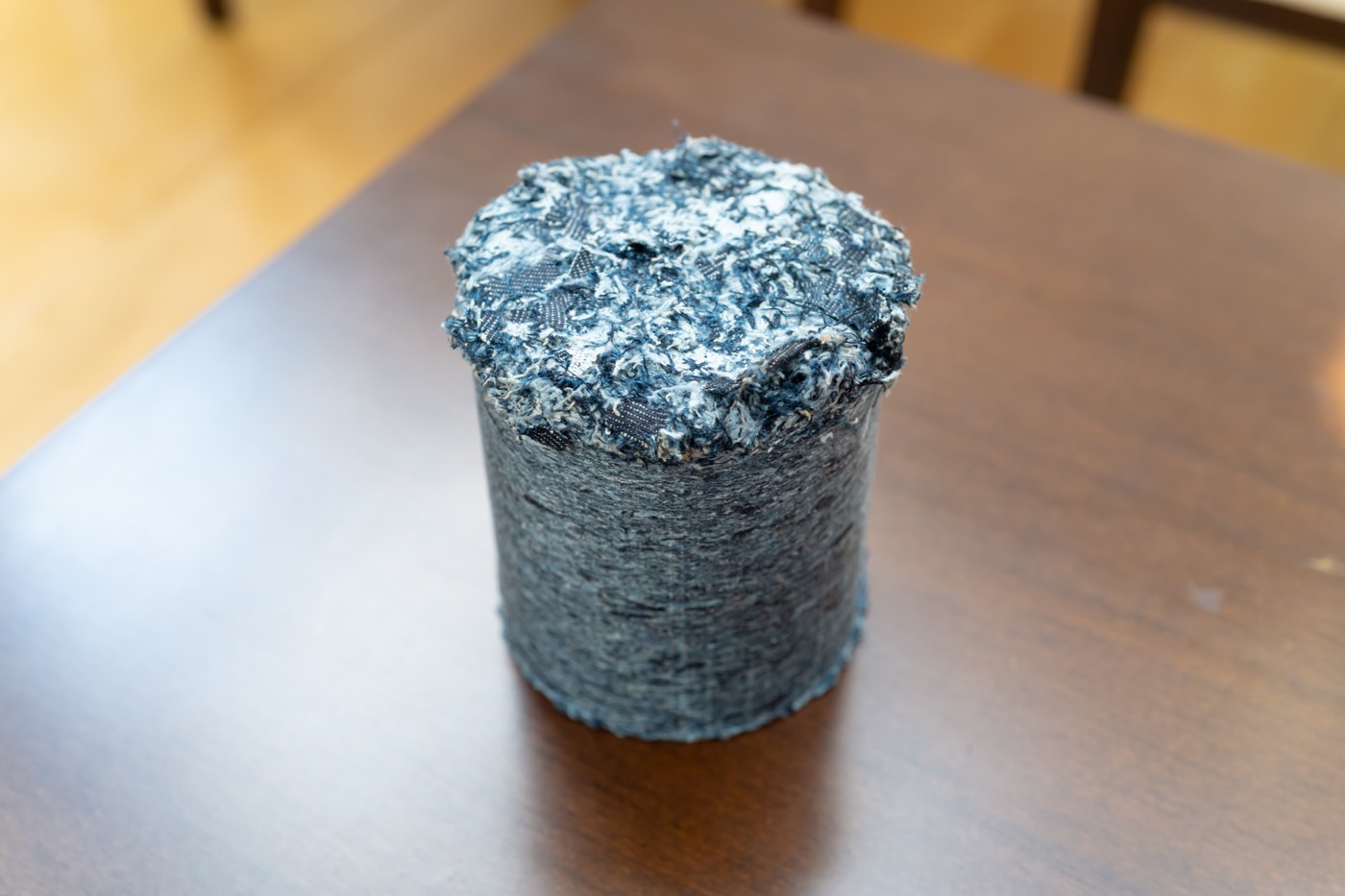 デニムで作られたバイオコークス。断面には繊維が残り、手触りもデニムの質感が残る。