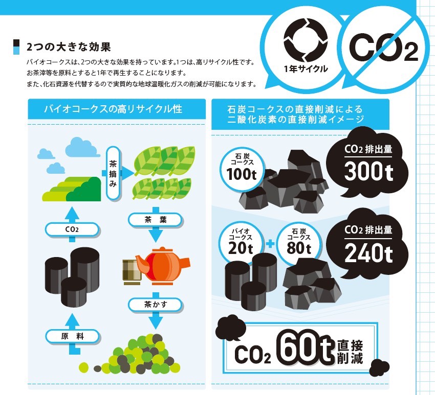 これまで100%石炭コークスを使っていたCO2の排出量が課題視されていました。石炭コークスの一部をバイオコークスに変えることでCO2排出量を直接削減を可能にします。