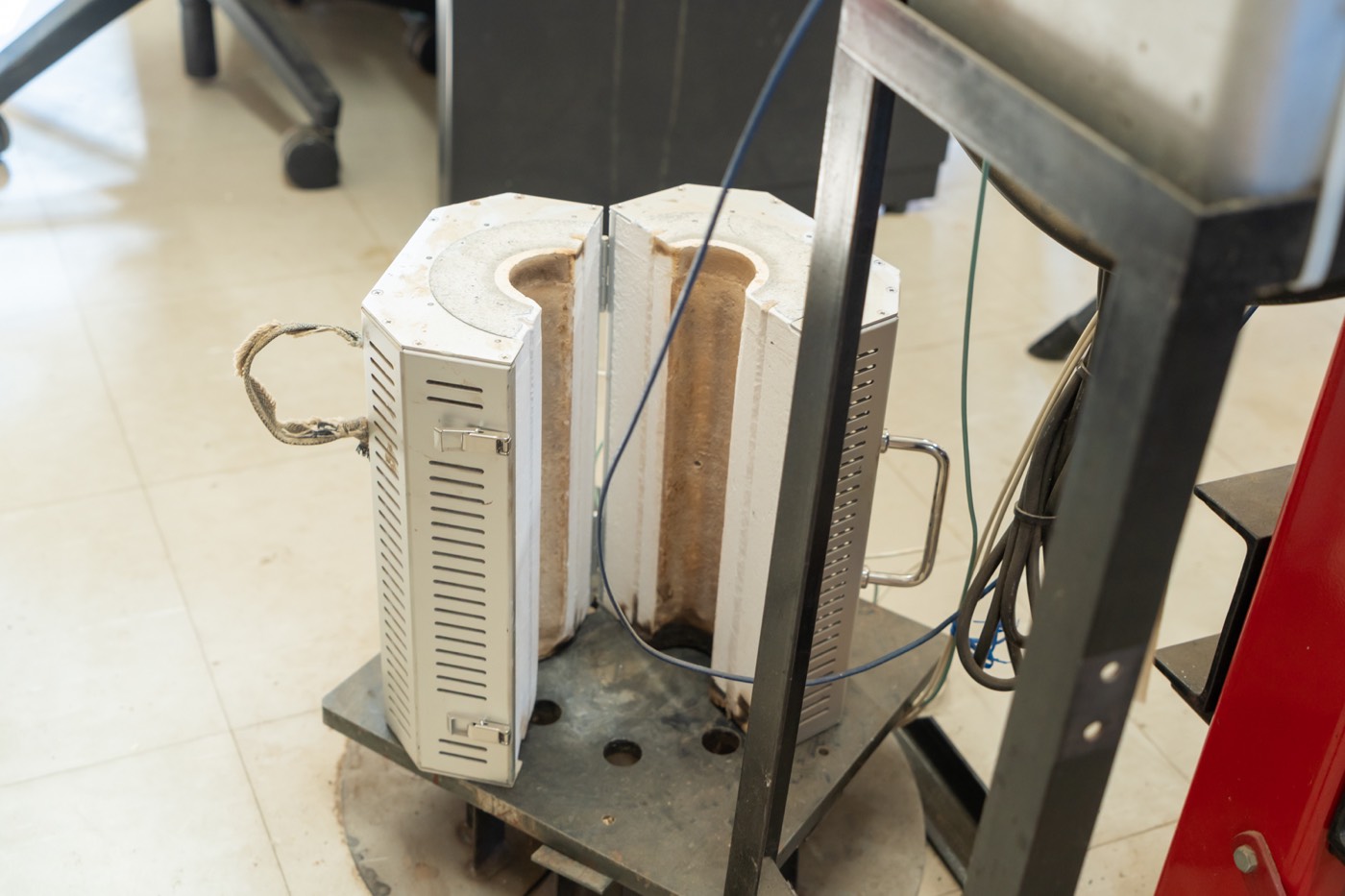 バイオコークス研究所内にある装置。粉砕〜乾燥させたバイオマスを成型するための反応シリンダーにいれる。