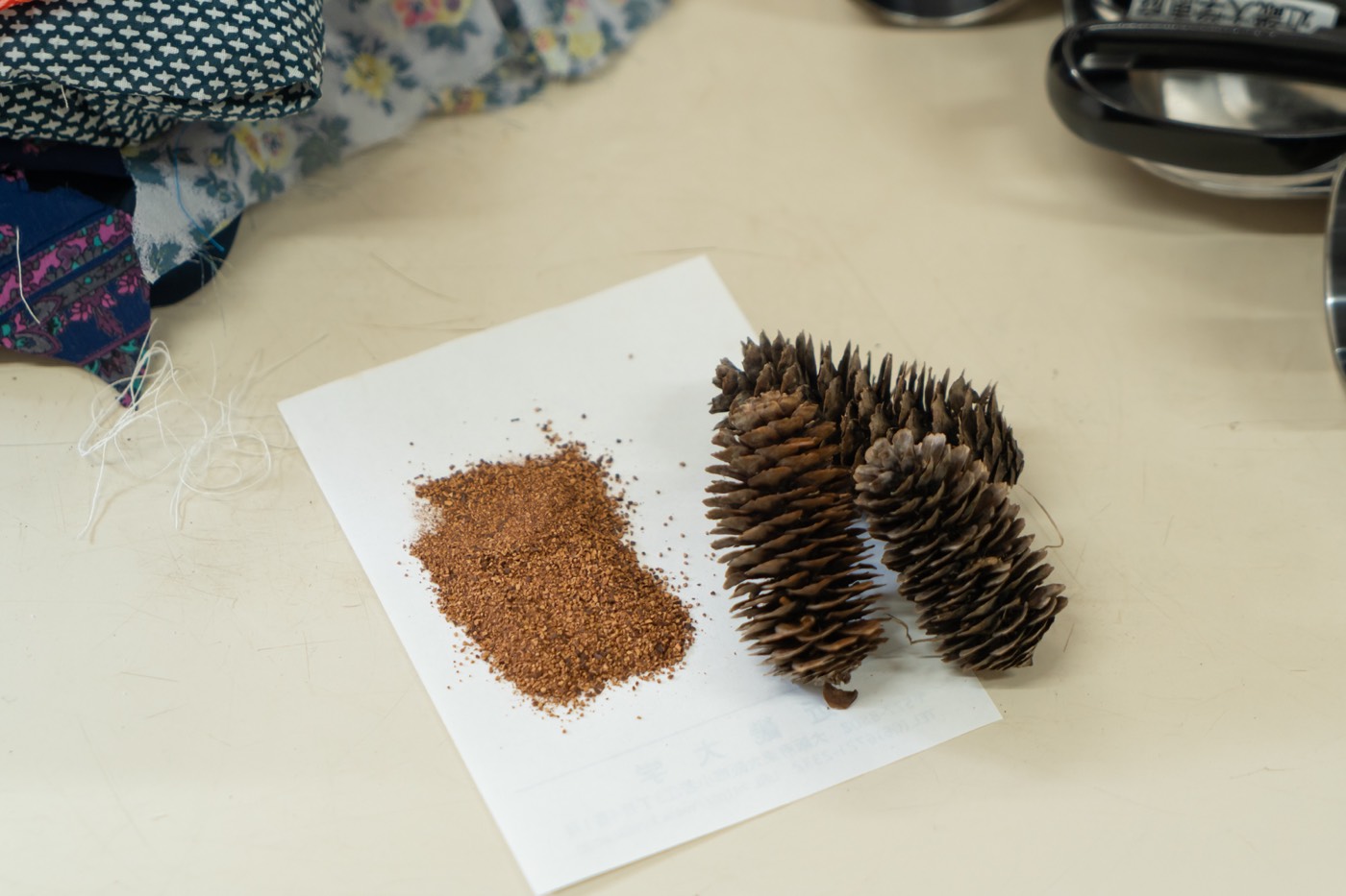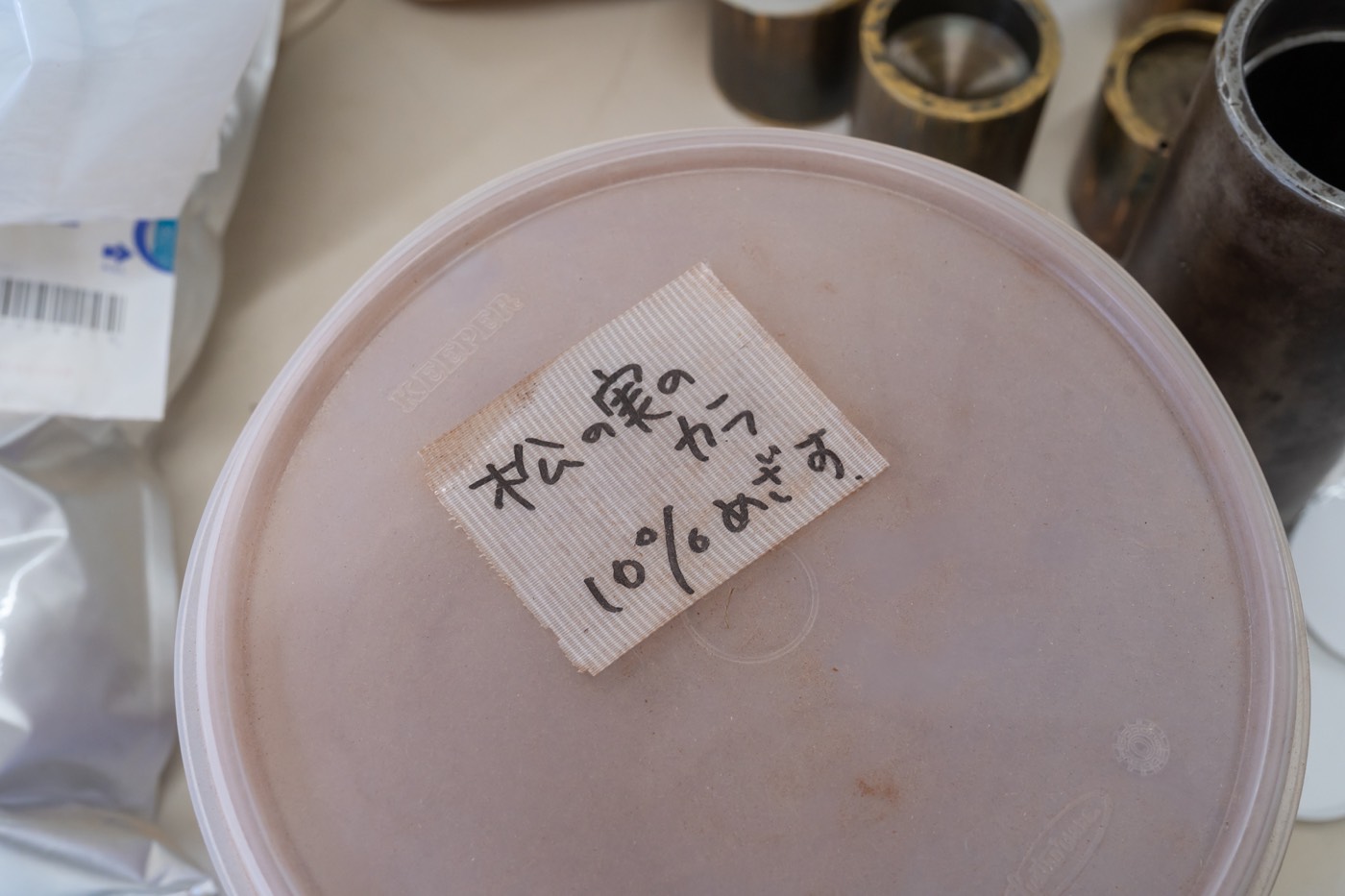 研究所の敷地にもたくさん落ちていた松ぼっくり。これからバイオコークスになるかの実験準備のため、細かく粉砕されている。